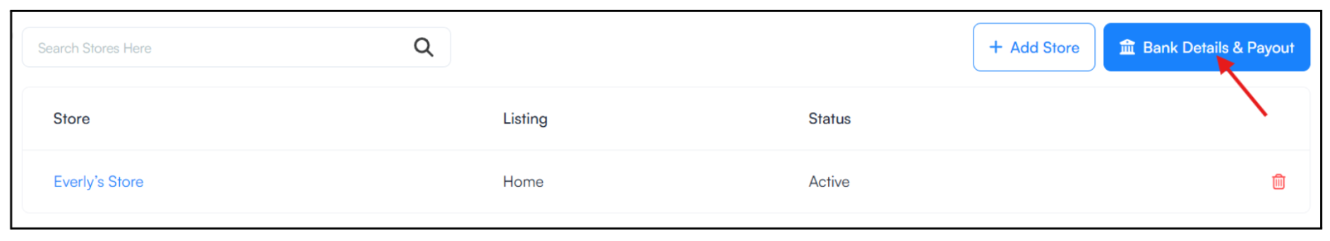 After creating a store, it will appear in the Stores list with an inactive status, meaning guests cannot place orders yet. To activate the store, click the Bank Details & Payout button located at the top right of the Stores page.